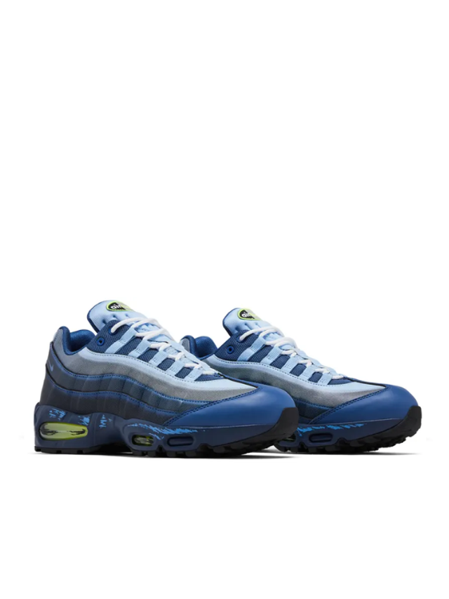 La silhouette reprend fidèlement le design porté dans la série, avec une tige en cuir superposé affichant un dégradé de bleu audacieux. Des accents vert néon dynamisent l’ensemble, visibles sur l’étiquette de languette “Air Muscle” brodée ainsi que sur les unités Air Max apparentes, intégrées dans une midsole bleue ornée de marques de griffures, clin d’œil direct aux chaussures de Joey dans l’univers Yu-Gi-Oh!.